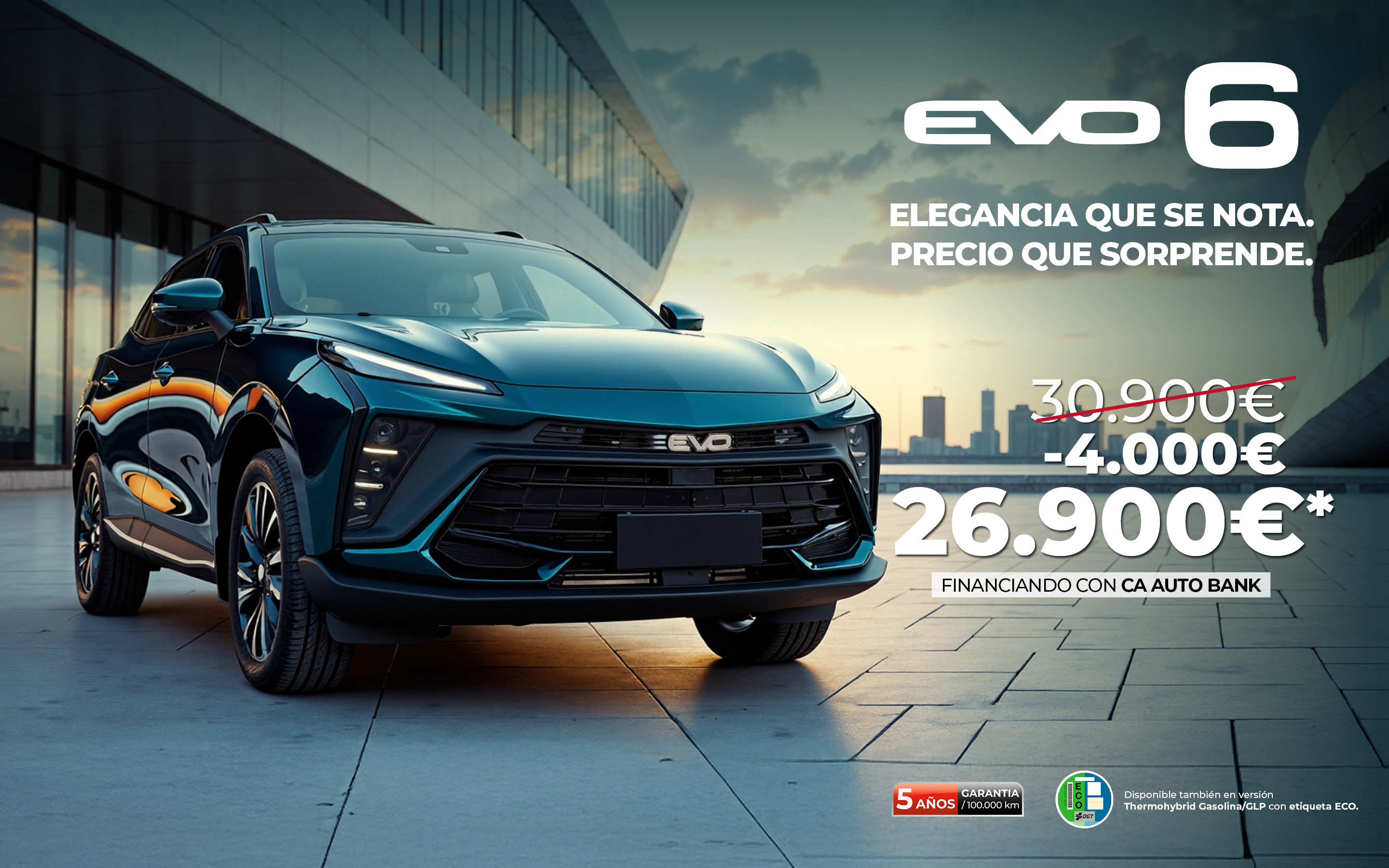 EVO 6 gasolina/GLP 1.5cc Turbo 130kw/176 CV. PVP Recomendado Financiando 28.400€. Incluye IVA, transporte, Impuesto de
